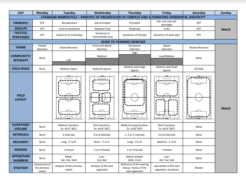 Man delar oftast in veckoplaneringen (mikrocykeln) i tre faser mellan matcher. Återhämtningsfas, högbelastade fas och matchförberedande fas. Dessa faser ska ses ur ett helhetsperspektiv där fysik, teknik, taktik(spelförståelse) och psykologi tas i beaktning och handlar inte bara om fysisk belastning. Det finns två stora grundteorier kring periodisering som vi kort ska beskriva.