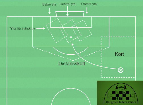 Ovan statistik om hörnor ger vissa likheter till frisparkar som slås från sidan in i straffområdet. Dels innebär skruven var bollen ska dimpa ner eftersom en innerskruv lättare fastnar i en horisontell zon(främre, bakre eller central) medan en skruv som går från målvakt mer sannolikt glider längs med linjen och ger alla zoner större möjlighet.