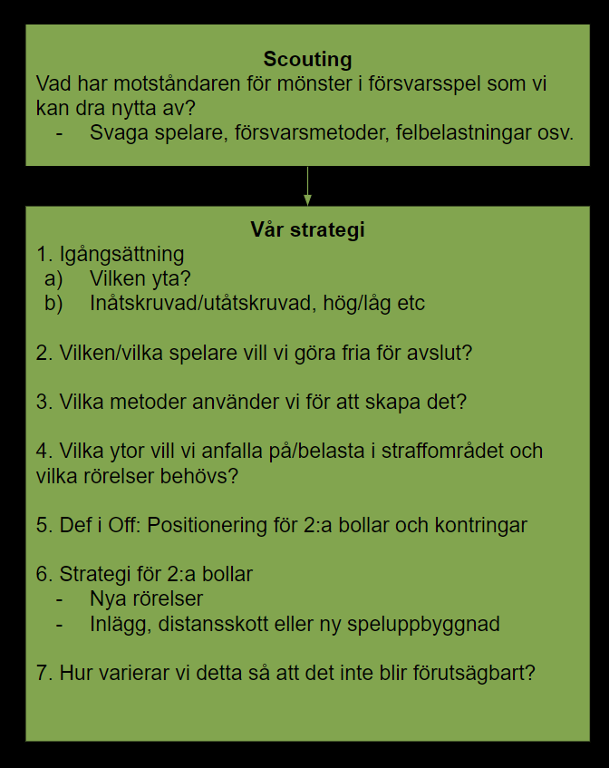 Denna överskådliga artikel är nu slut och det finns mycket kvar att skriva om. Förutom varianter och djup i det redogjorda har vi inte skrivit om matchplan, träning och tillämpning i praktiken i stort i form av scouting och uppföljning av utförandet.